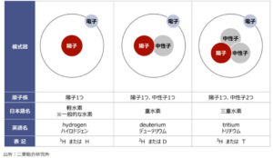 トリチウムは、日本語で「三重水素」と呼ばれる水素の仲間(同位体)です。水素と聞くと、原子核の陽子一つの周りを電子が回っている「軽水素」を想像される方が多いでしょう。水素の仲間には、原子核が陽子一つと中性子一つで構成される「重水素」、そして原子核が陽子一つと中性子二つで構成される「三重水素」の「トリチウム」があります。