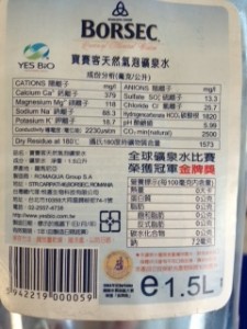 ボルセックの台湾ラベル(裏面)。欧米は勿論、アジアでも美味しい水は愛されるという証左。細かく見ると、蒸発残留物はあっても硬度表記はありません。