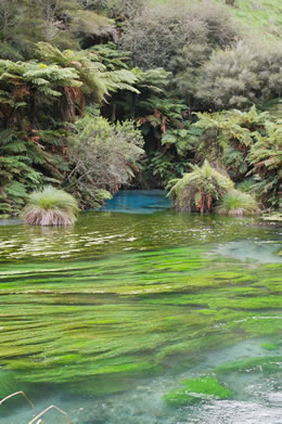 ワイホウ源流の湧水群で、湧水量、水質、景観の全てにおいて比類なき存在として知られるのが「ブルースプリング」。名前のとおりの鮮烈なトゥルー・ブルーの源泉が複雑構造の丘陵の割れ目の奥で輝いている。静謐でありながら圧倒的なスケールでその冷泉を包む周囲一帯に時々こだまする聞きなれない鳥達の鳴き声、それは無音よりかえって静けさを増すようでもあり、そこを訪れる人間はただじっとその青に魅入ることになる。