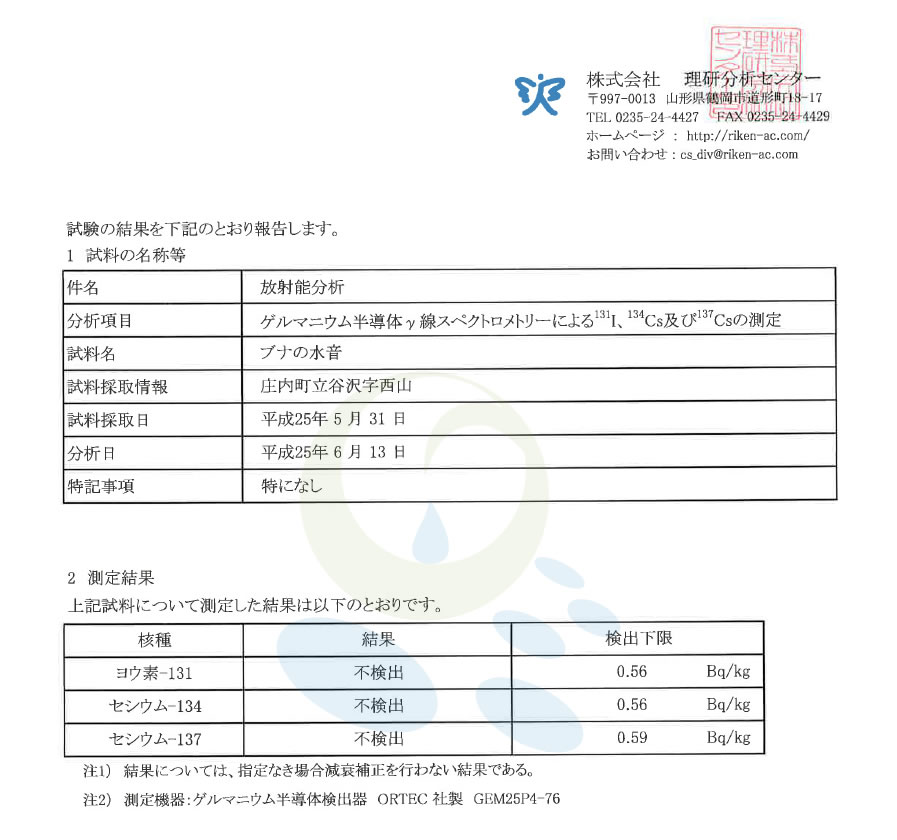 【ブナの水音、放射能分析結果】 ヨウ素-131:不検出! セシウム-134:不検出! セシウム-137:不検出! 安心と安全のブナの水音の分析結果⇒ 詳細はコチラ |